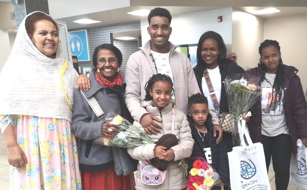 Relatives and Nest members welcomed an Eritrean family of four to Saskatoon on November 7, 2024, capping a six-year effort to bring the two sisters and the two children to the city. They were reunited with their brother Zemichael and aunt Saba Andu.