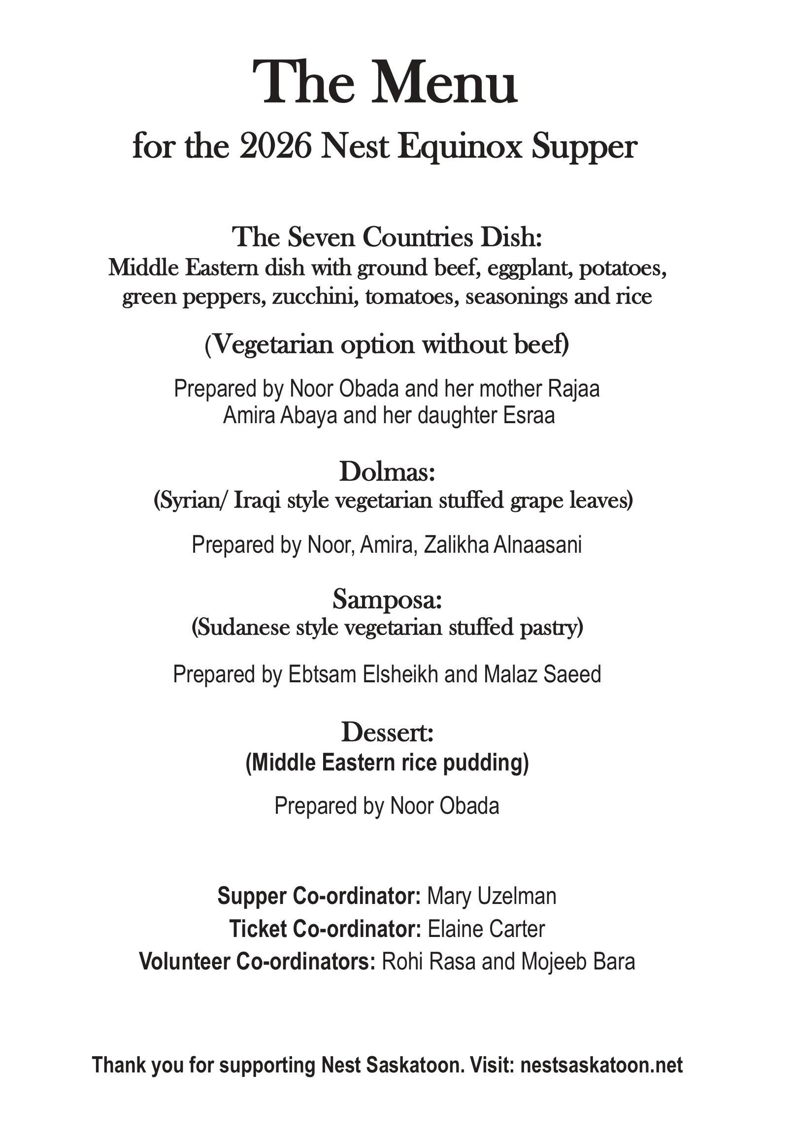 The menu for the Equinox Supper features: The Seven Countries dish (seasoned ground beef and 6 vegetables) with rice, Syrian dolmas (stuffed grape leaves), Sudanese samposas and a Middle Eastern rice pudding dessert. The Equinox Supper also includes vegetarian and gluten-free options. Make your meal choice when you buy your tickets.